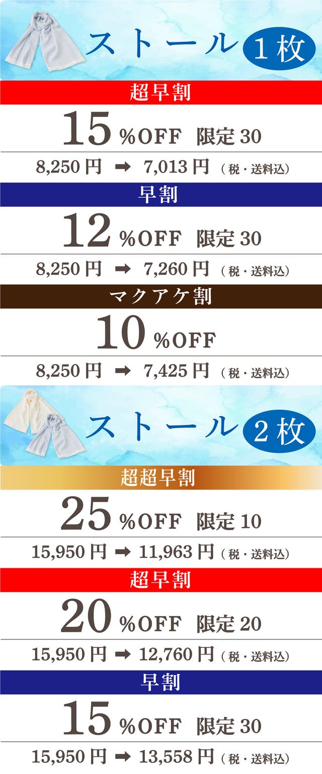 数量限定の超早割、早割もご用意しております。いずれも他では出せない異例の割引価格ですので、お早めに!