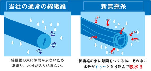 特殊な撚糸加工新無撚糸は、糸にたくさんの隙間があるので、その中に水分をどんどん吸収しやすい構造になっています。