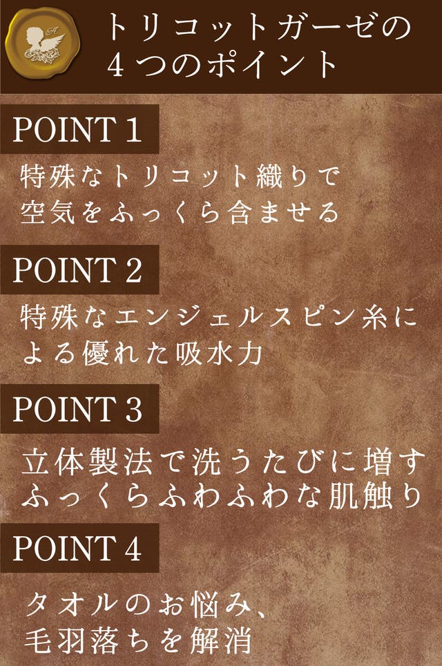 - タオルの為に糸から開発!特殊加工を施したエンジェルスピン糸使用で抜群の柔らかさ。