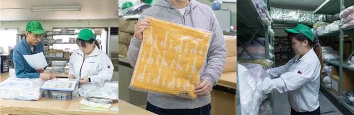 出来上がった商品を一つ一つ丁寧に検品し、仕上げていく物流・加工現場では、商品に不良がないか、商品がお客様の元に届いたとき、より美しく見える仕上がりになっているか、メンバー一人一人の厳しい目でチェックしています。