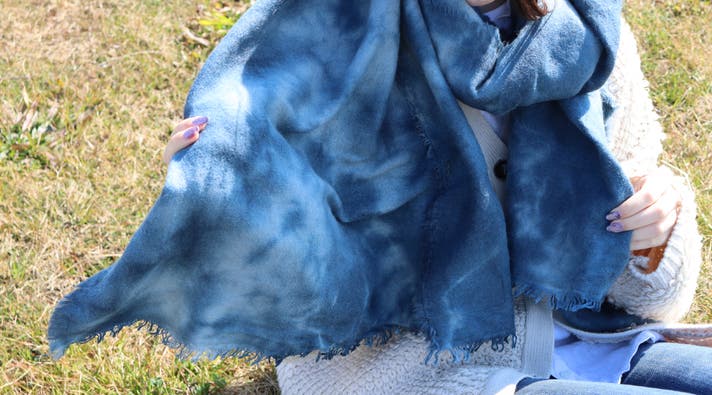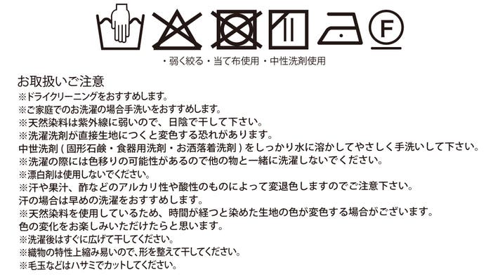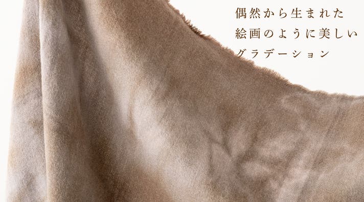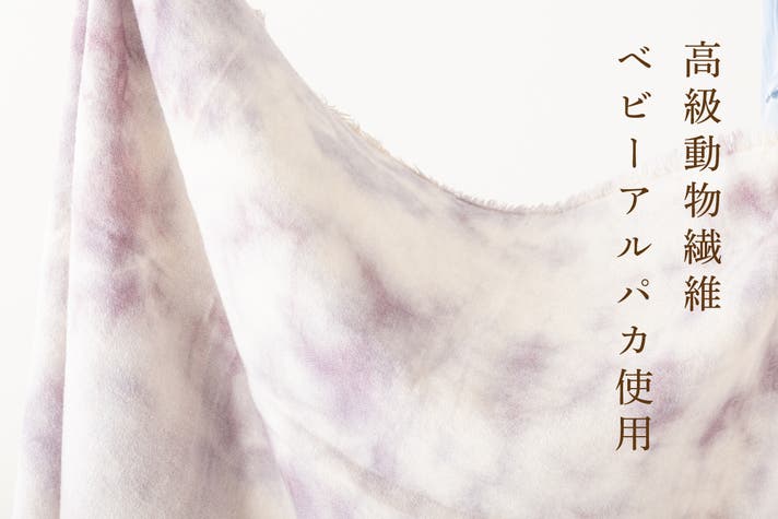 本場ペルー産の希少なベビーアルパカを贅沢に使用し、その柔らかな風合いを最大限に活かした生地に、“新万葉染め”という天然染料を用いた技法で絞り染めを施しました。