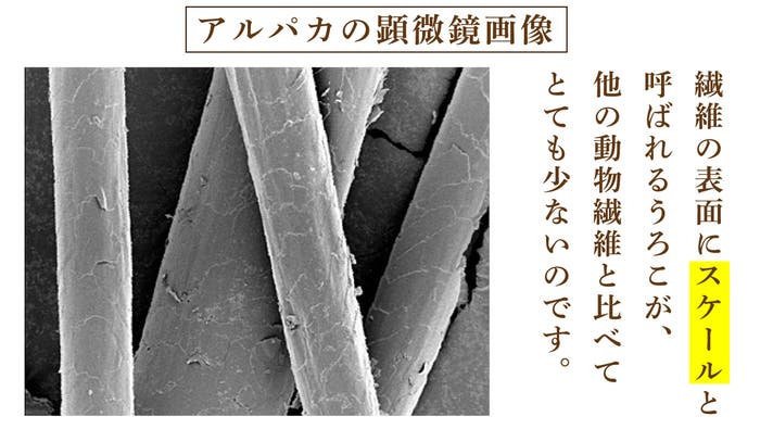 アルパカの繊維は表面の「スケール(うろこ)」が他の動物繊維に比べて少なく、細くて直毛、さらに油分を含むため、とてもなめらかな肌触りです。