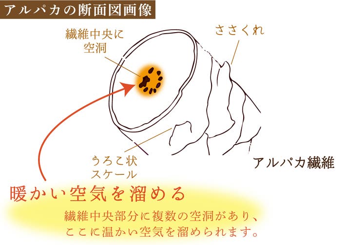 アルパカの特殊な毛の構造により、繊維の内側中央部分に空洞があり温かい空気を溜められます。