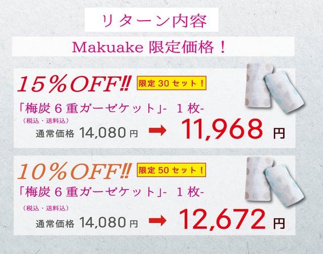 「Makuake(マクアケ)」は、実行者の想いを応援購入によって実現するアタラシイものやサービスのプラットフォームです。このページは、 プロダクトカテゴリの 「寝汗をかきやすい人必見!サステナブルな梅炭素材で消臭効果!梅炭6重ガーゼケット」プロジェクト詳細ページです。
