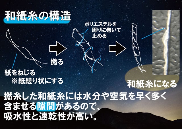 天然繊維が主原料の和紙は非常に吸水がよく、植物繊維である綿とよく馴染み、乾燥も早い優れた素材です。