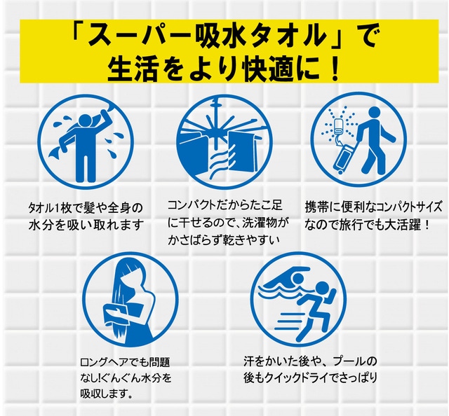 タイトル:タオル一枚で貴方の生活が変わる!水分をグングン吸い取るスーパー吸水タオル!