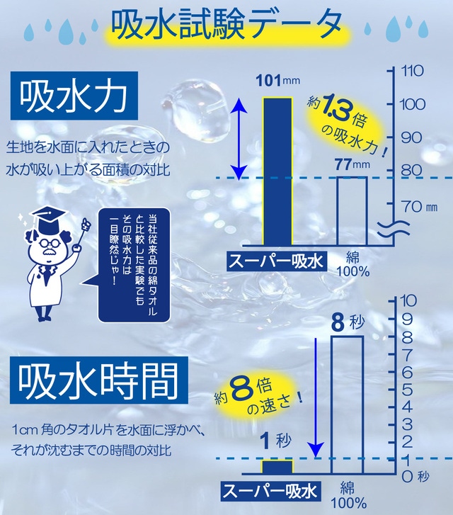 同規格の綿100%のタオルと比較しても、約8倍の吸水スピードとなっており、少ない生地面積で優れた吸水性を発揮します。