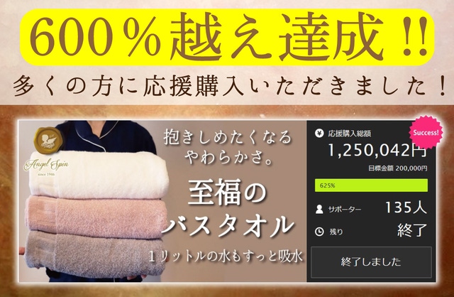 前回行いました至福のバスタオルでは、プロジェクト開始時から多くの応援購入をいただき、目標金額の600%を売り上げました!