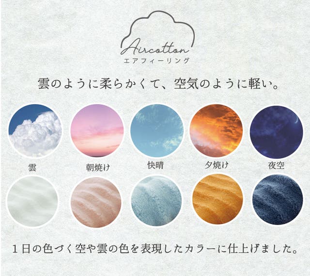 高級極細綿糸を特殊加工し(エアーフィーリング®糸)、たっぷり空気をふくんで、雲のように柔らかく仕上げています。卵を上から落としても割れない柔らかさ!女性や赤ちゃんにも快適にご使用頂ける柔らかさを目指しました。