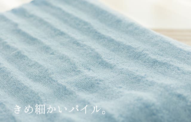 通常のタオルに使用される糸の約半分の細さの高品質な極細綿糸を使用しており、とても軽くて、きめ細かいパイルになっています。たっぷりのボリューム感を実現しました。