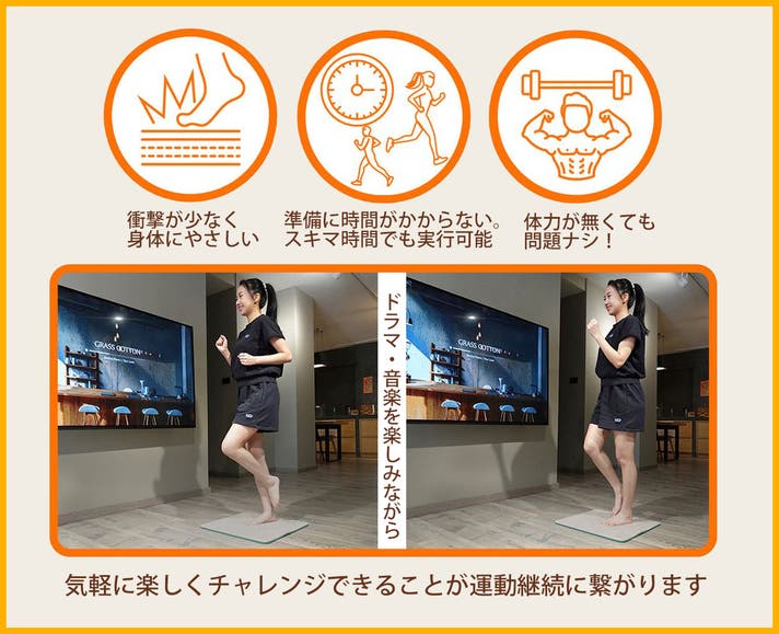 TOMOTOMOジョギングマットは健康のために運動を始めたいあなたのお手伝いをできる商品です。自宅でスキマ時間にできる、映画、音楽を楽しみながらできる「ながら運動」向きの商品。大きな器具でインテリアを邪魔することもなく、どこにでも持ち運びも簡単。電源も不要。あなたの「運動を楽しむ気持ち」を応援します!