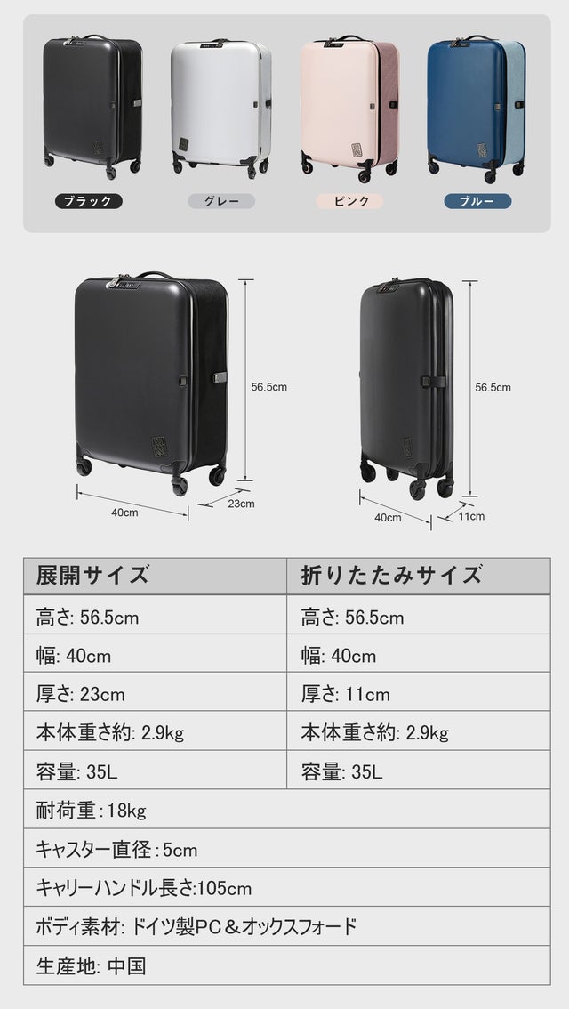 - 本体の収納スペースを大幅省略!11センチまで折り畳め、大容量スーツケース