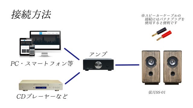 弦月SS-01のご使用に関してはPCやスマートフォンと弦月SS-01の間にスピーカー用アンプを接続してご利用ください。