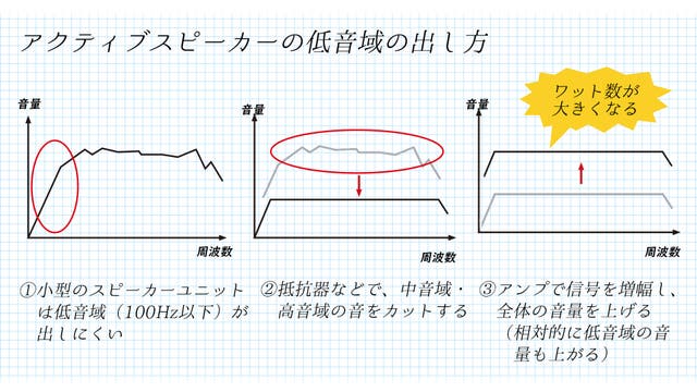 しかし小型なのに(スピーカーのコーンが大きくないのに)ワット数が大きいというスピーカーは、低音域を持ち上げるために一旦中音域・高音域を抵抗器などで抑え、全体を電気的に増幅させるために電力を使います。