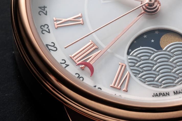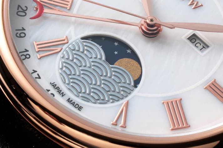 ムーンフェイズの表示部には「青海波(せいがいは)」という、平安時代から存在すると言われている日本の伝統的な文様をデザインしています。