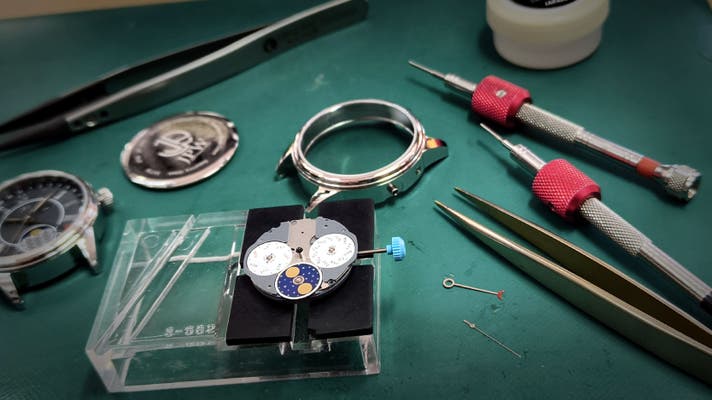 大阪にある弊社のブースにて、長年腕時計を扱い続けてきた職人が1本1本組み立てています。