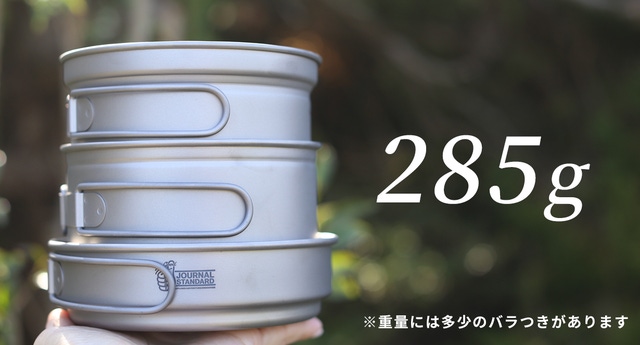 片手に収まるサイズ感で総重量が285gと超軽量ながらも、フライパンは500ml、小鍋は750ml、大鍋は1,000mlの容量で、ソロキャンはもちろん、ご家族でもこれ一つあればさまざまなシーンで利用することができます。