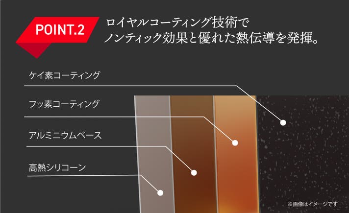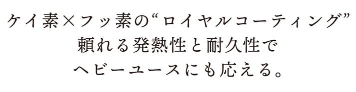 レンジストームの要、「ロイヤルコーティング」は、セラミックの一種・ケイ素の高い熱伝導性と耐久性に、フッ素のノンスティック性能を絶妙なバランスで融合。