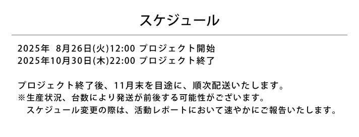 このプロジェクトはAll in型です。目標金額の達成に関わらず、プロジェクト終了日の2025年10月30日までに支払いを完了した時点で購入が成立します。