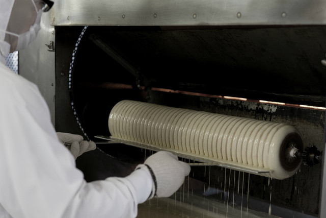 バウムクーヘンは全自動オーブンで出来上がるイメージかもしれませんが、オーブンの前には必ず職人がいて、生地の様子を1層1層チェックしながら、焼きあげていきます。