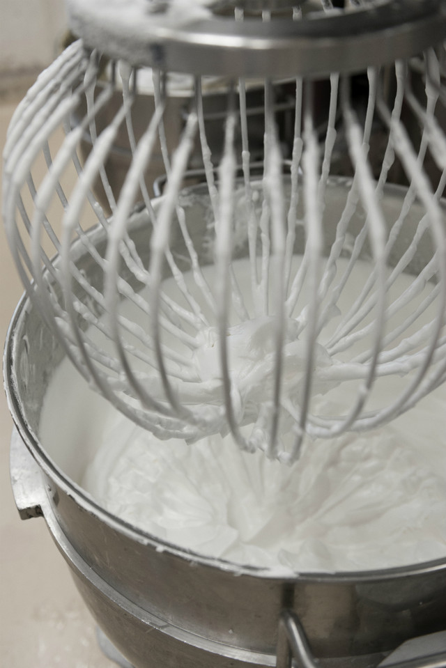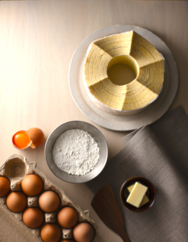 こちらのバウムクーヘンの生地は「別立て法」という手法で作られています。卵黄とバターを合わせた「卵黄生地」と、卵白と砂糖を合わせた「メレンゲ」を、粉と混ぜ合わせてつくります。