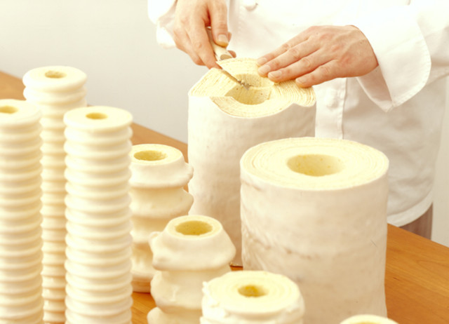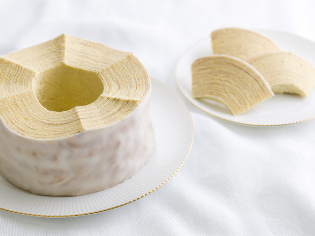バウムクーヘンはドイツ語で「木のお菓子」という意味です。由来は「木の棒に巻きつけて焼くから」と「切り口が年輪のようだから」と2つの説があります。