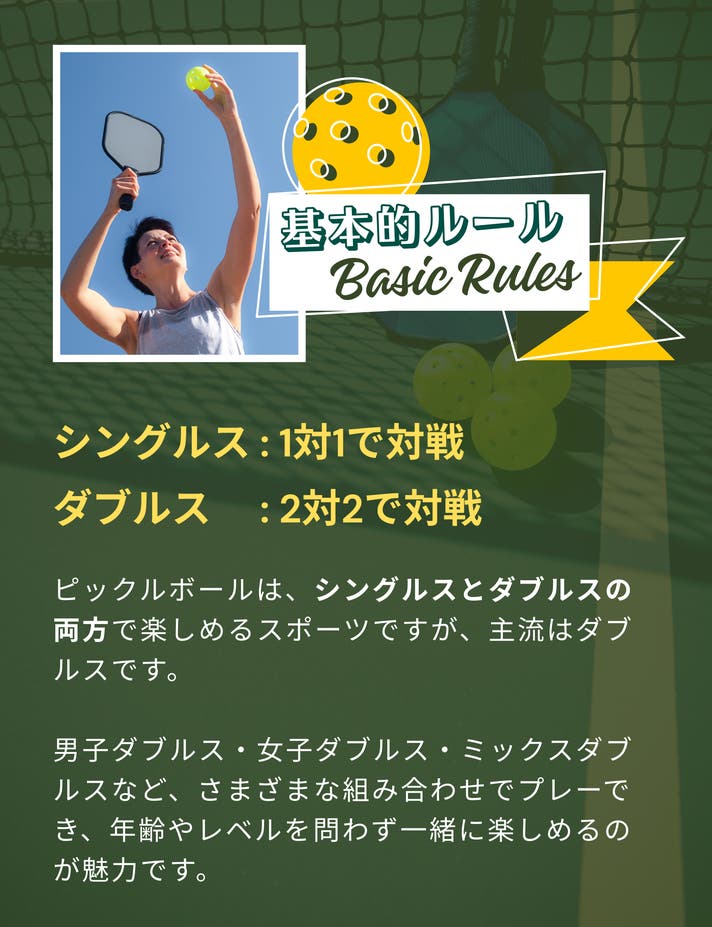 軽量ラケットとゆっくり飛ぶボールで、年齢も経験も関係なく誰でも楽しめるのが特徴。真剣勝負も、のんびりプレーも自由自在。その楽しさがピックルボールの魅力です。