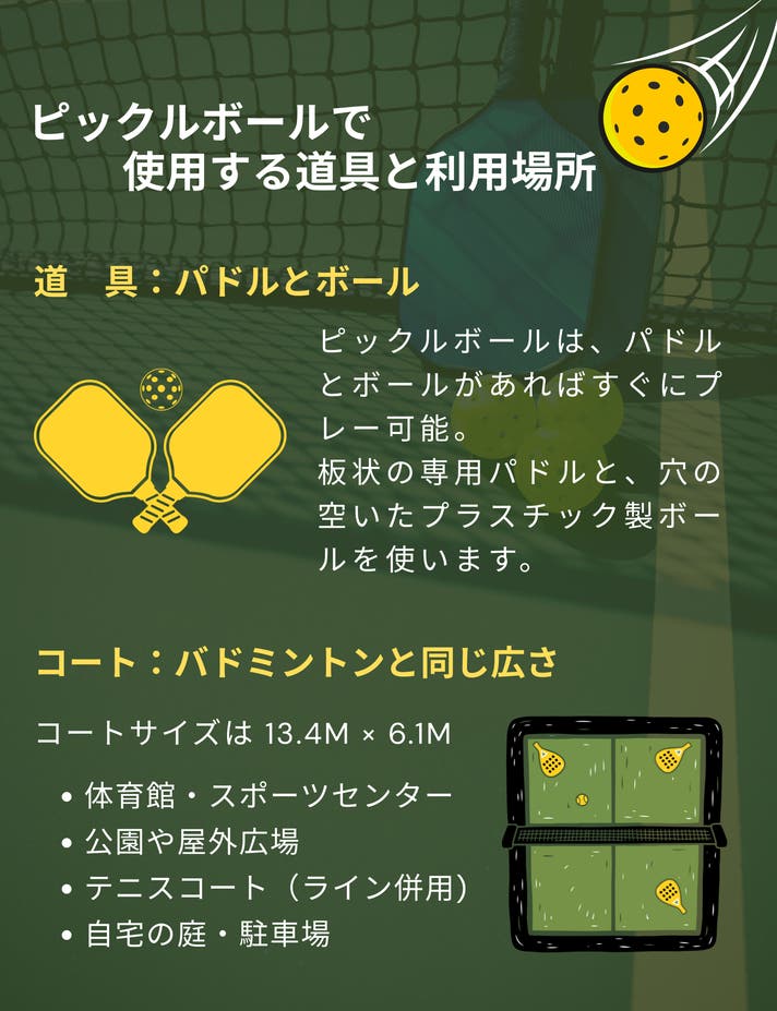 ピックルボールはテニスより小さいコートで遊べるため、庭・公園・屋内などどこでも楽しめます。