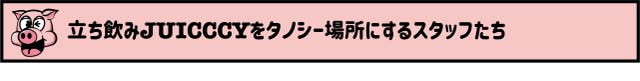 某有名ホテルの元シェフや、声優のお仕事をしている人など、個性豊かなスタッフが立ち飲みJUICCCYを盛り上げ、皆様にとっての行きつけのお店になれるようタノシー場所作りをすることをお約束します!