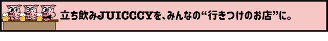 立ち飲みJUICCCYは、いろんな楽しみ方ができるので、みんなの”行きつけのお店”になれるよう毎日元気よく頑張っていきます。