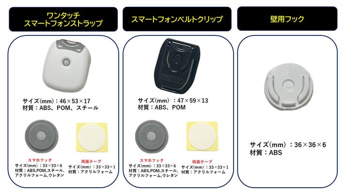 ベルトクリップ×1、スマホフック×1、追加両面テープ×1
