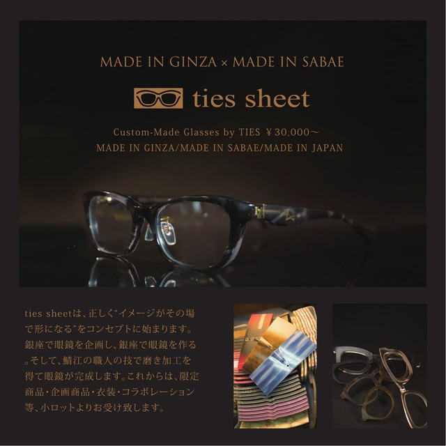 日本のメガネ作りの技術を世界に繋ぐ、時代を繋ぐ、文化を繋ぐ、そして思いを繋ぐ。世界的に有名なメガネの産地鯖江と我々tiesの思いをコラボレーションさせたフレーム。