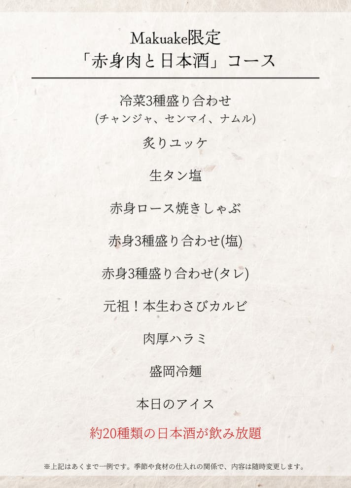 今回はMakuake限定で、日本酒がより進むような、赤身肉を中心としたコースを特別にご用意。