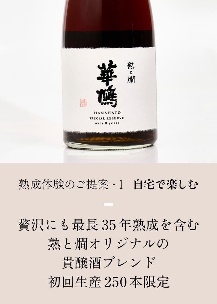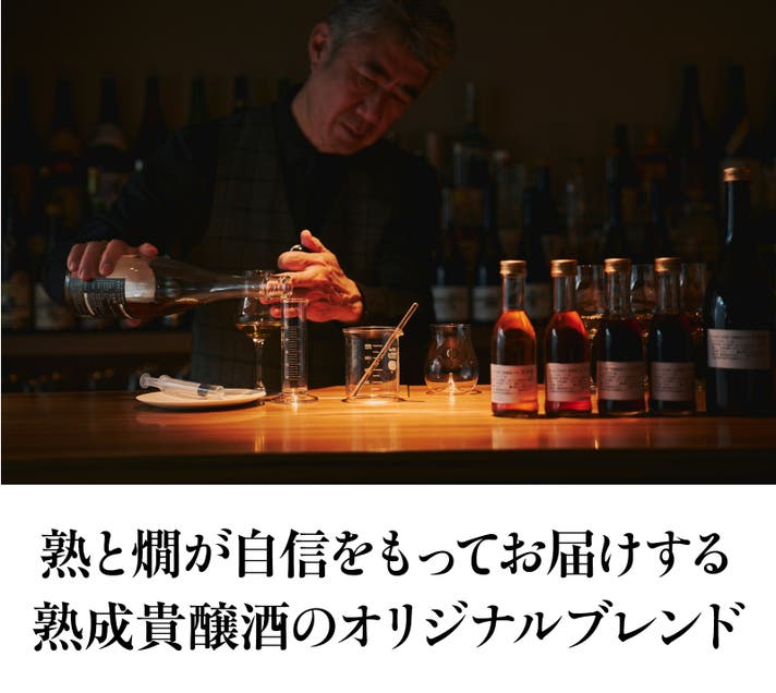 「熟と燗」Shop & Barにて、様々なお客様に熟成酒を提供している当社社長兼BARマスター上野が、よりステージの高いお酒にするべく“奥行きと複雑味”を加えるため、自ら厳選した異なるヴィンテージの華鳩貴醸酒をオリジナルでブレンド。