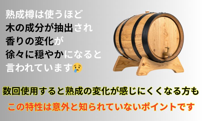 ・樽は木材の大部分が早い段階で香りを出し切ってしまい、 繰り返し使うほど香りは弱くなる。