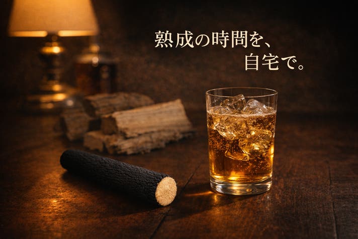 北海道産ミズナラを使用したウイスキー熟成スティック「熟成の木」。ボトルに入れるだけで、自宅で本格的なウイスキー熟成と熟成ハイボールづくりが楽しめます。炙り加工で繰り返し使える設計。ホームバー時間を格上げする逸品として、ウイスキー好き晩酌好きへのプレゼントに。大人の方への贈り物としておすすめです。