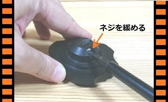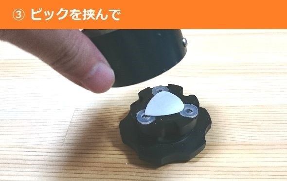 ピックを挟んでツマミを押さえながら回して加工する。