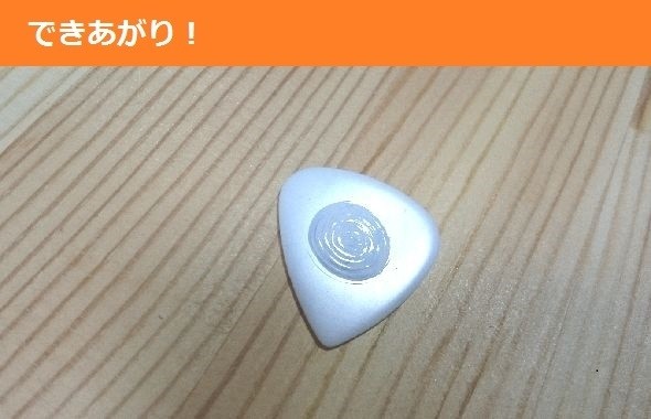 白地ピックの表裏両面に『Pick Inscriber くるくる』でピック中央近傍に直径約15mmの範囲の滑り止め加工を施します。