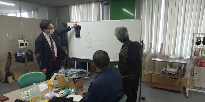 また、機能面で理学療法士、アスレチックトレーナーと歩行の質をサポートする為の「膝サポーター」について打ち合わせを行いました。テーピング理論、膝の動き、膝疾患などについて教えていただきながら今回の「歩行サポーター」の方向性を決めていきました。