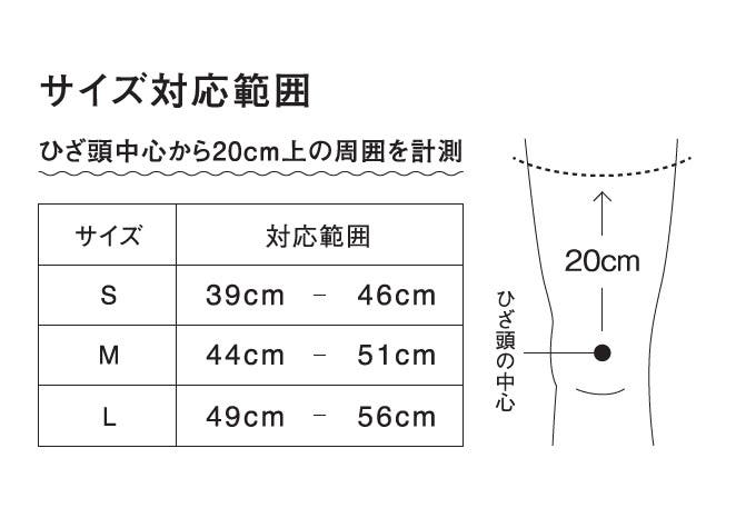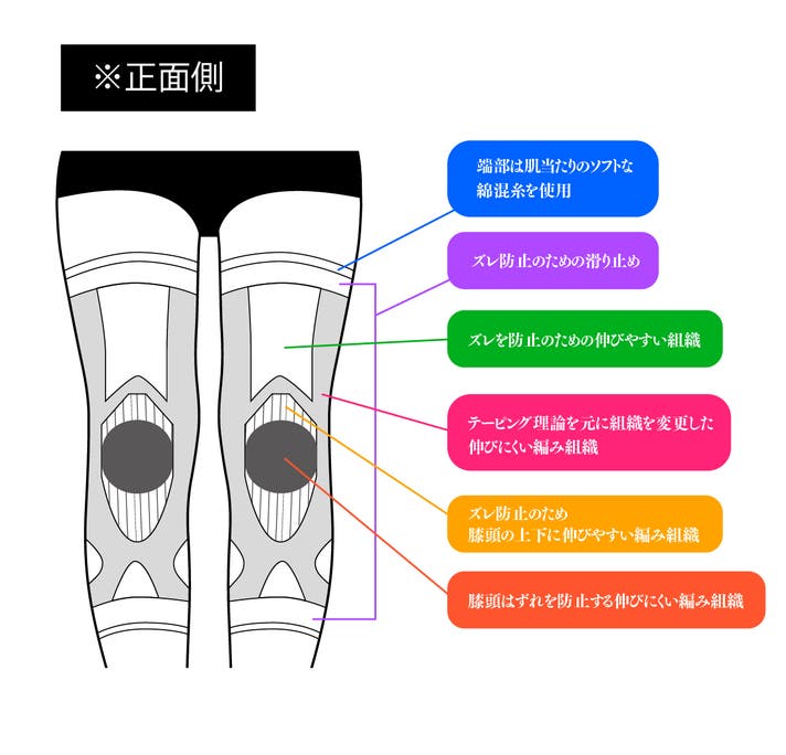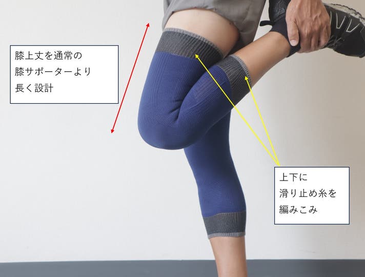 膝サポーターのよくある悩み「歩いているとズレる」。そのせいで膝サポーターの着用をやめてしまう方も多いと思います。このサポーターは「皮膚に近い伸縮性」を持たせる事と膝上約20cmと長めに設計して上下に滑り止め糸を配置しているのでズレにくい設計にしております。