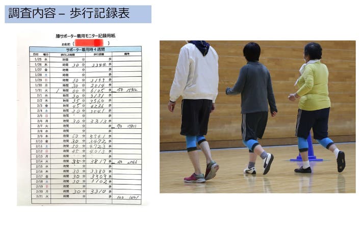 約40名にご協力を頂き、2週間普段のウォーキング時間、距離について記録を依頼しました。その後6分間歩行をサポーターあり・無しで実施しました。