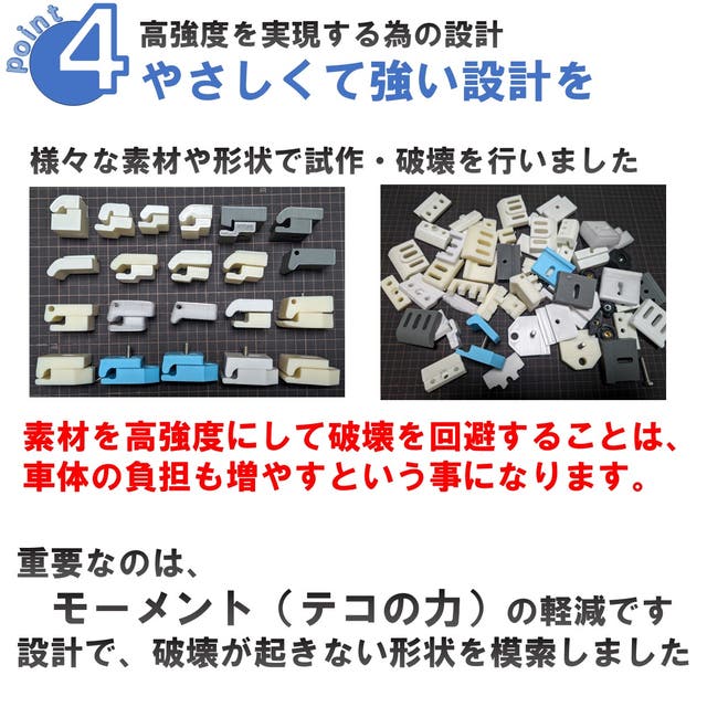 - 取付も調整もしやすい。車に密着する低重心の安定形状