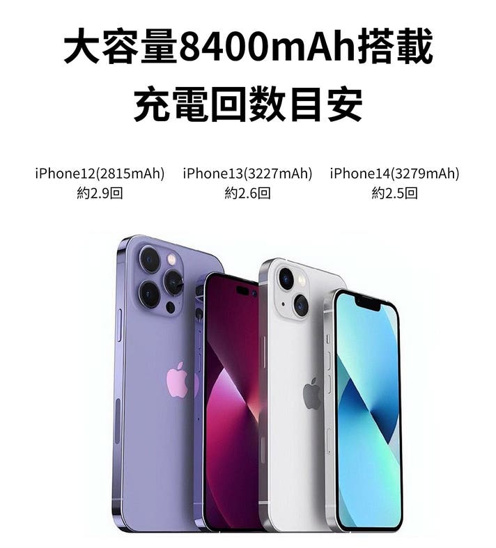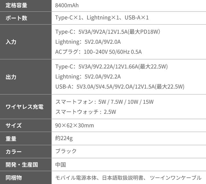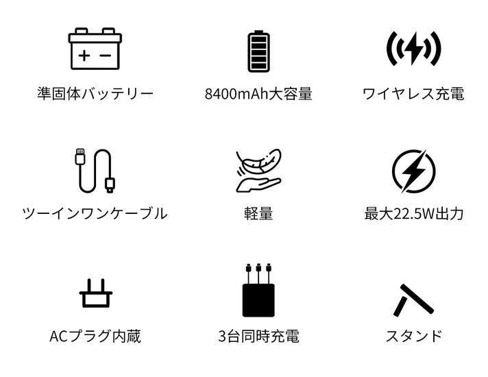 8400mAh+ワイヤレス充電+ツーインワンケーブル+ACプラグで、ポケットにすっぽり収まる一台に。