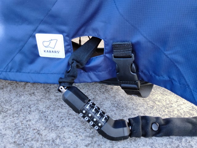後輪側のファスナーの頂点に隙間ができるため、裏返してフタをする防水キャップを取り付けました。このキャップを持ち手として利用できる上に、後輪側上部が見つけやすくなります。フックにかける時にもこの部分を引っ掛けます。