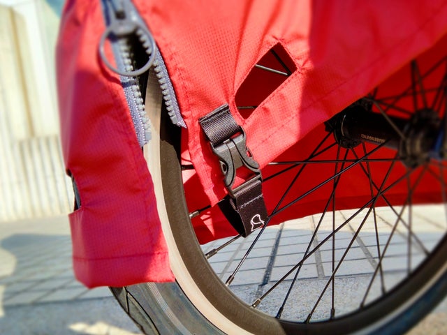 前後のタイヤのスポークにそれぞれバックルテープを通し、自転車本体とカバーを繋ぎます。強風でカバーが飛んでいくのを防ぎます。