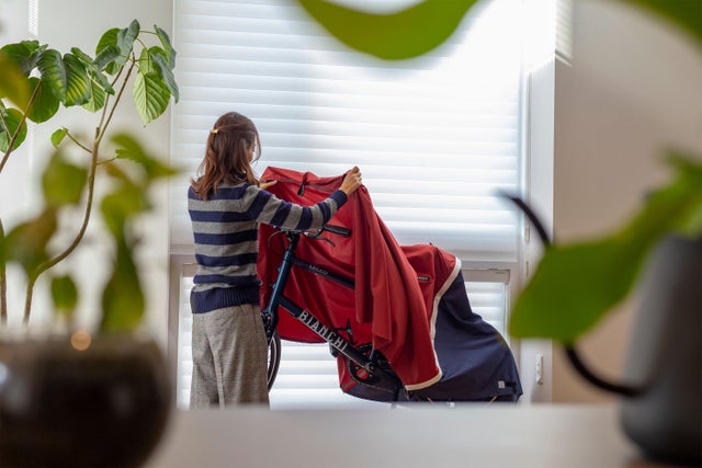 気に入っている自転車なのでおしゃれなカバーは嬉しい。ショールームの店頭に置いてある自転車なので、オシャレなカバーをしていると、雑然感がなく、訪れるお客様へのお迎えにとても良い。