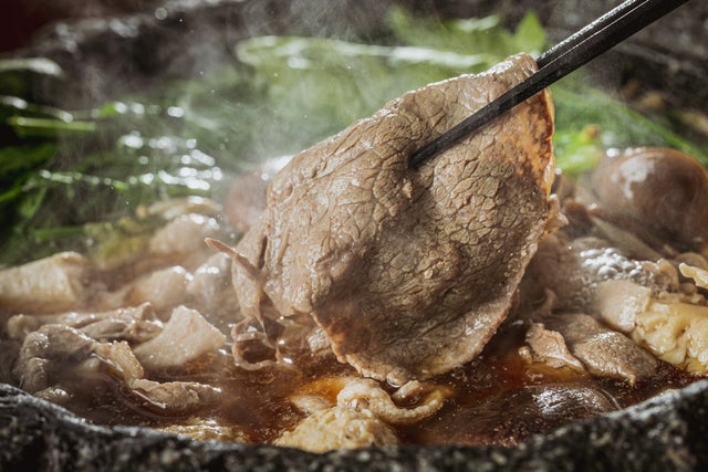 - たっぷりの肉と野菜が入った石鍋。こってりした見た目に反して、無限に食べられるほどあっさり。