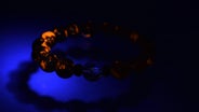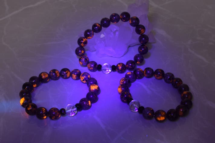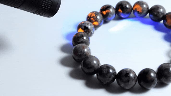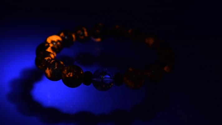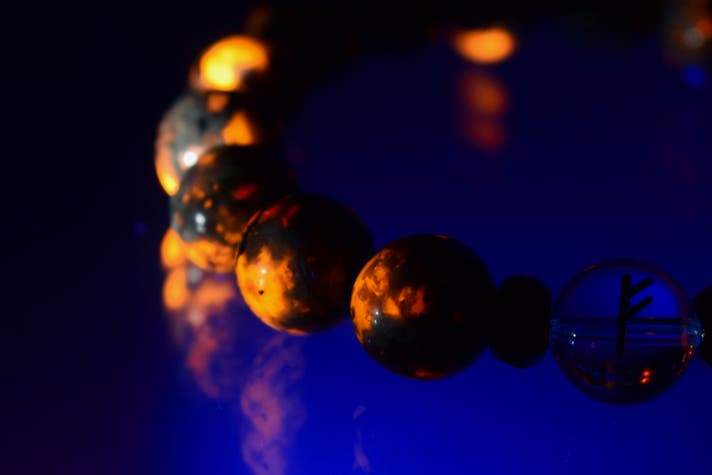 ブラックライトをこのブレスレットに当てると、明るい場所でもまるで地中から湧き出るマグマのようなオレンジ色の発光が。