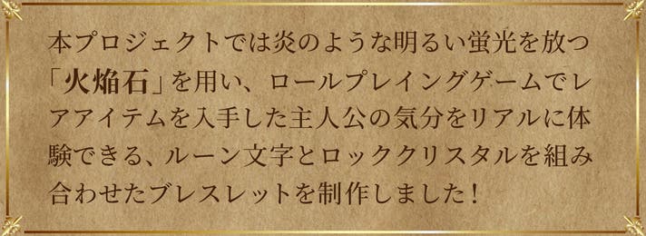 今回、「光る石」があるという情報を入手し、実際にその目で確かめ、商品化する運びとなりました。ブラックライトで「火焔石」のように明確に蛍光を示す石は非常に珍しく、まさに「お宝」感が強く、ゲームでレアアイテムを手にした時の高揚感に似ていました。そこでリアルにレアアイテムを手にした感動を体験できるアクセサリーとして、「火焔石ブレット」のプロジェクトを立ち上げました。