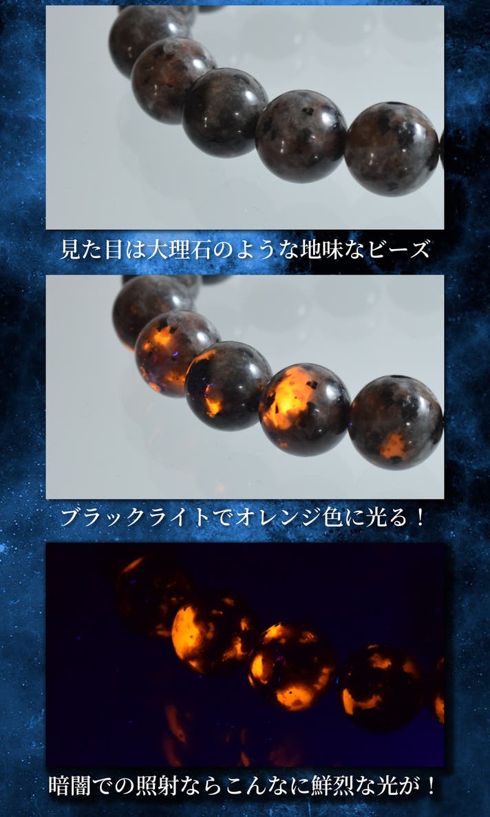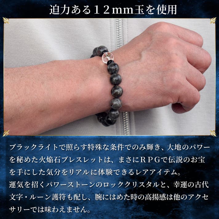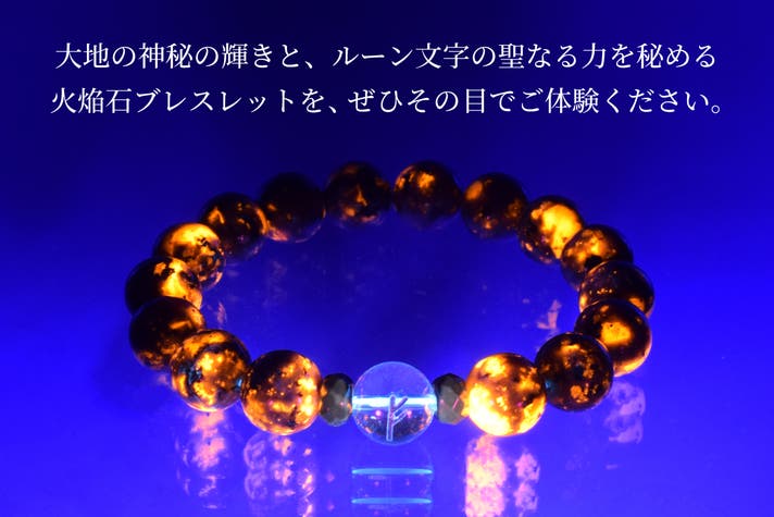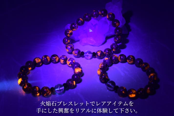 - ブラックライトでマグマの炎のように蛍光発光するレアストーン「火焔石」を用いたブレスレット。